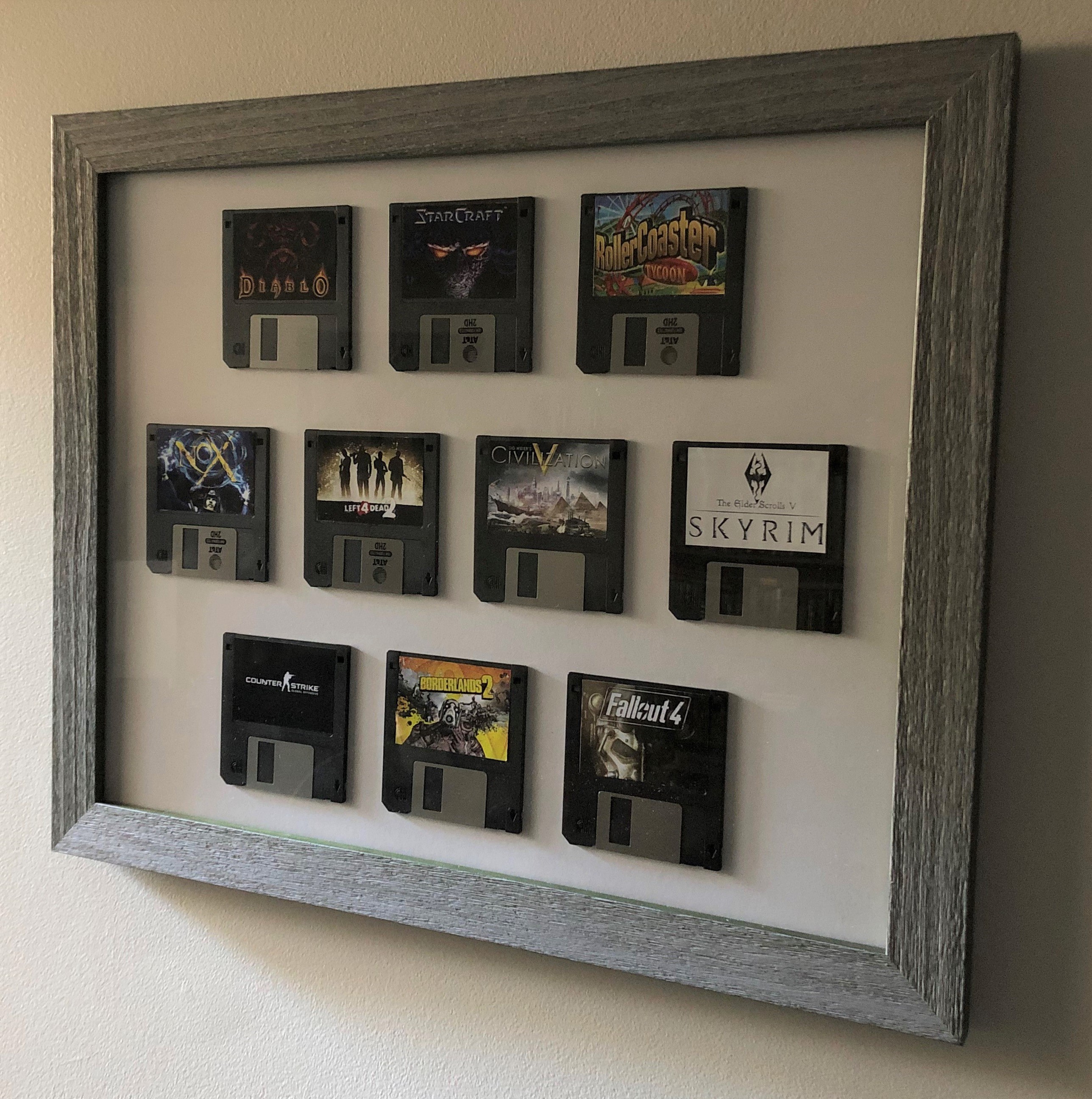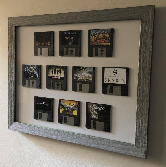 One of my very best friends, Radutron as he goes by, e-mailed me around Christmas asking me to list my favourite video games growing up and to write a short blurb about why I chose each one. A couple of weeks later I received a package (we live far away from each other now) and opened it up to find that list in the form of floppy disks. He had custom printed labels on each of them with my chosen games logos and on each disk there is a text file with my blurb of why I chose it. He did not want to frame them and then ship them as the glass could break in transit but planned on sending me a gift card as well to have them framed. While I appreciated his offer for the second portion of the gift, I told him I’d like to try and custom build a frame. Eventually that did not happen as building a frame is extremely finicky work and my woodworking skills are nowhere near there yet. But I did end up buying a frame and spent my time trying to neatly space the disks in an even fashion and put them a chronological order of release date.