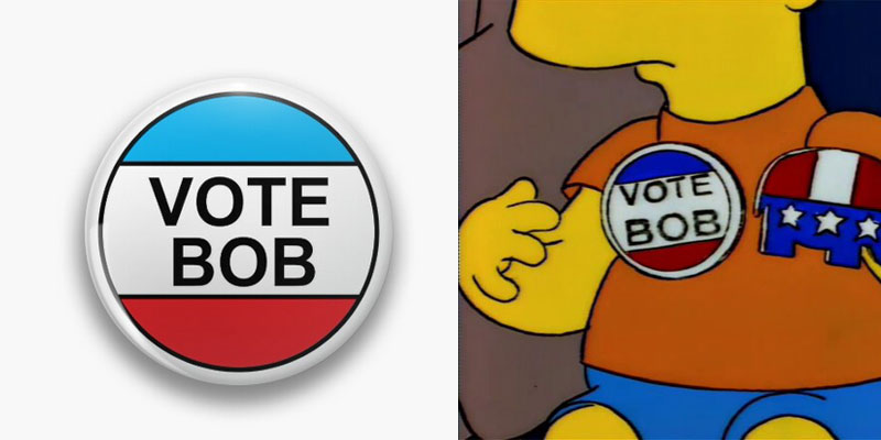 Can’t get more simple than this. This is a button that was pulled out of a henchman’s suit pocket instead of an expected gun in episode 5 of season 6 called “Sideshow Bob Roberts” when Sideshow Bob successfully (but not really) runs for Mayor of Springfield.