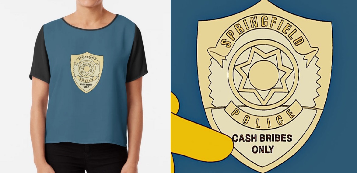 A while back I had posted a picture on my Instagram about some previous Simpsons drawings I made for my RedBubble shop. Someone in the comments asked for something related to the Springfield police department so I thought I’d look into it. While the Springfield police are shown quite often in The Simpsons, most of the time they’re zoomed out so their badges are just a small shape. After a little more digging, I found that in season 15 episode 16 called “The Wandering Juvie” the show does a close up of Wiggum’s badge with the motto “cash bribes only” so I felt it was a perfect fit.