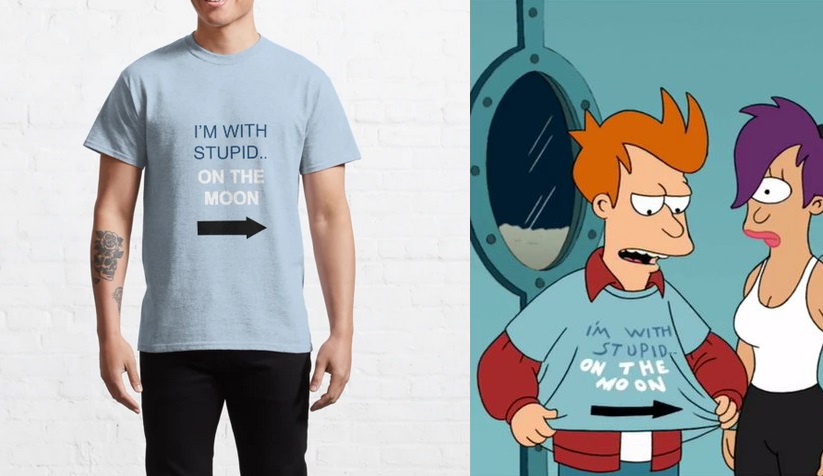 And with this design I’ve now expanded into four cartoons. This one comes from Futurama season 1 episode 2 called “The Series has Landed”. Fry’s first delivery in the year 3000 is to the moon, something he always looked up to and dreamed about visiting back in his life in the 1900s. But now the moon is a commercialized tourist spot and rather underwhelming for him. If you watch this episode, you might get the “we’re whalers on the moon” song stuck in your head like I did.