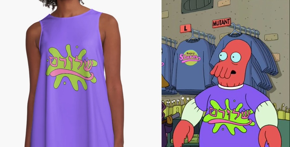 In episode 4 of season 2 in Futurama called “Fry and the Slurm Factory” we see the Futurama gang win a tour of the Slurm factory where the delicious soft drink is produced. Unlike the story it’s satirizing the group finds the horrific secret of the drink while deviating from the tour and the usual absurdity ensues. At one point Zoidberg tries on a shirt that’s “a little tight around the thorax” and I decided to go ahead and make the alien logo into a design.