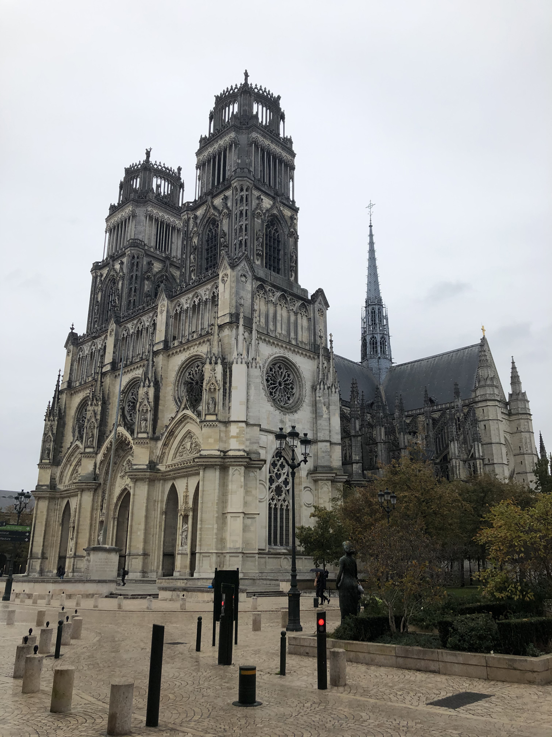 As we drove into the town, we noticed that there was a massive Gothic cathedral not too far from the hotel we were staying at. So we decided to take a stroll around the core of the city and went to visit it. The Orleans Cathedral (also known as the Cathedral of the Holy Cross of Orléans) is generally acknowledged to be well over 700 years old, though there have been many reconstructions over time due to damage during wars and structural issues. The site where it sits has been designated for a church as early as 375 BC and prior incarnations of the church existed on the same spot. When we eventually made it to Notre-Dame in Paris many days later, my first thought was that it seemed smaller than the Orléans Cathedral, though my friend disagreed. A quick wiki check on my phone showed that indeed I was correct. Notre-Dame sits at a daunting 226’ tall at the peak of the towers and an even 300’ at the spire prior to its partial destruction in the fire of 2019. But it is in fact overshadowed by the Orleans Cathedral which sits at a massive 289’ tall at the towers and a dizzying 374’ at the top of the spire.