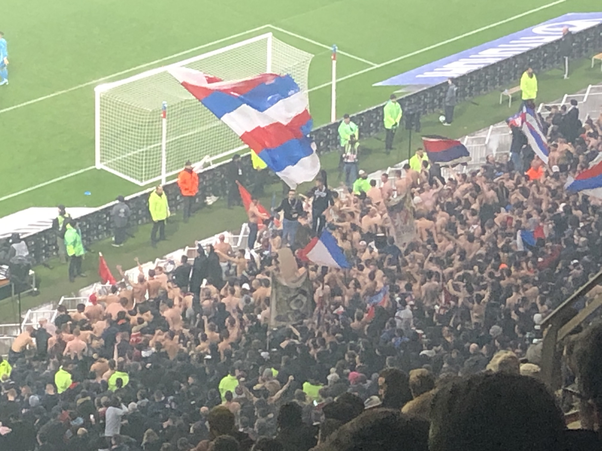 No European soccer game would be complete without hooligans of course. Here you can see the shirtless group which were ranting and raving the whole time. While the temperature was around freezing, I think that they were amply filled with beer and kept their body temperatures up by all the dancing and jumping they were doing.