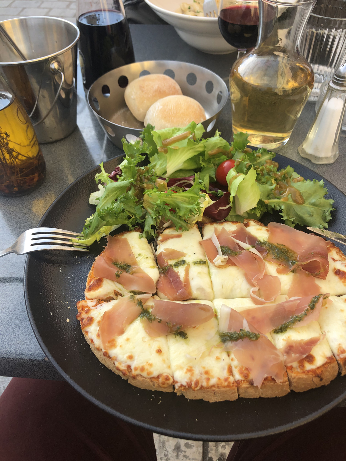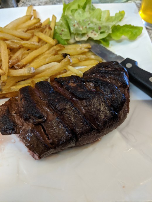 The French love their food, and in doing so respect their chefs. As you can see by the empty tables all around us, the time we stopped for food was right during the majority of restaurants chef breaks. This is something we weren’t aware of prior to visiting France and definitely made us stand out as tourists. I tried to dig around on the internet if there is an actual term for this downtime but didn’t find one. From what we gathered, during this time other employees cannot cook meals for customers. They may be able to make you a cold snack if you’re lucky though. Also, during this time the other employees will not bother the chef if customers do come and therefore many restaurants are empty. It was close to the end of the chef break time, so we sat down and had some wine until we could order food.