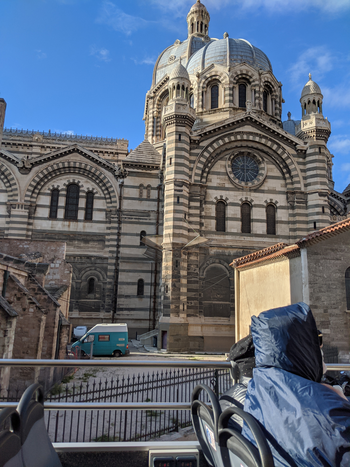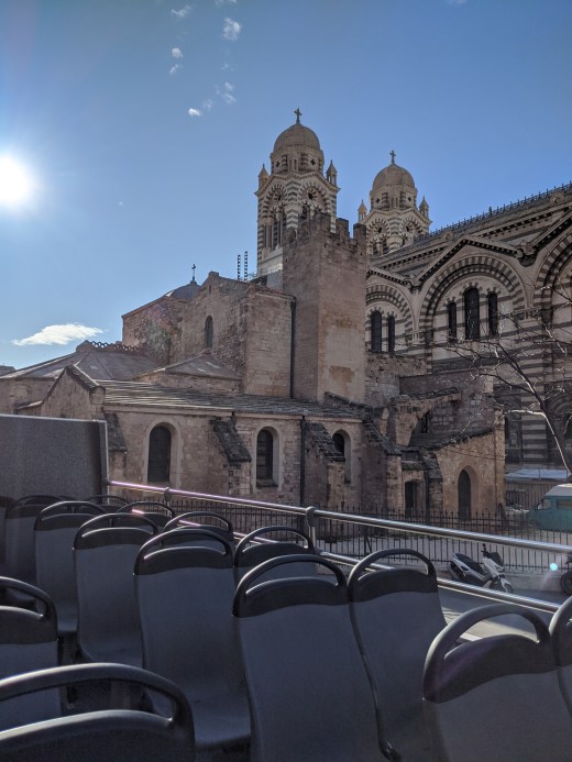 After our bellies were full of wine and food, we grabbed tickets for the Hop-on Hop-off bus tour through the city. One of the first places it went by was the Marseille Cathedral, but we did not stop and go for a tour as by the looks of it there was construction work around it, most likely restoration work being done to keep it in good shape. In the pictures above, the building is actually the new cathedral, which was completed in 1896.