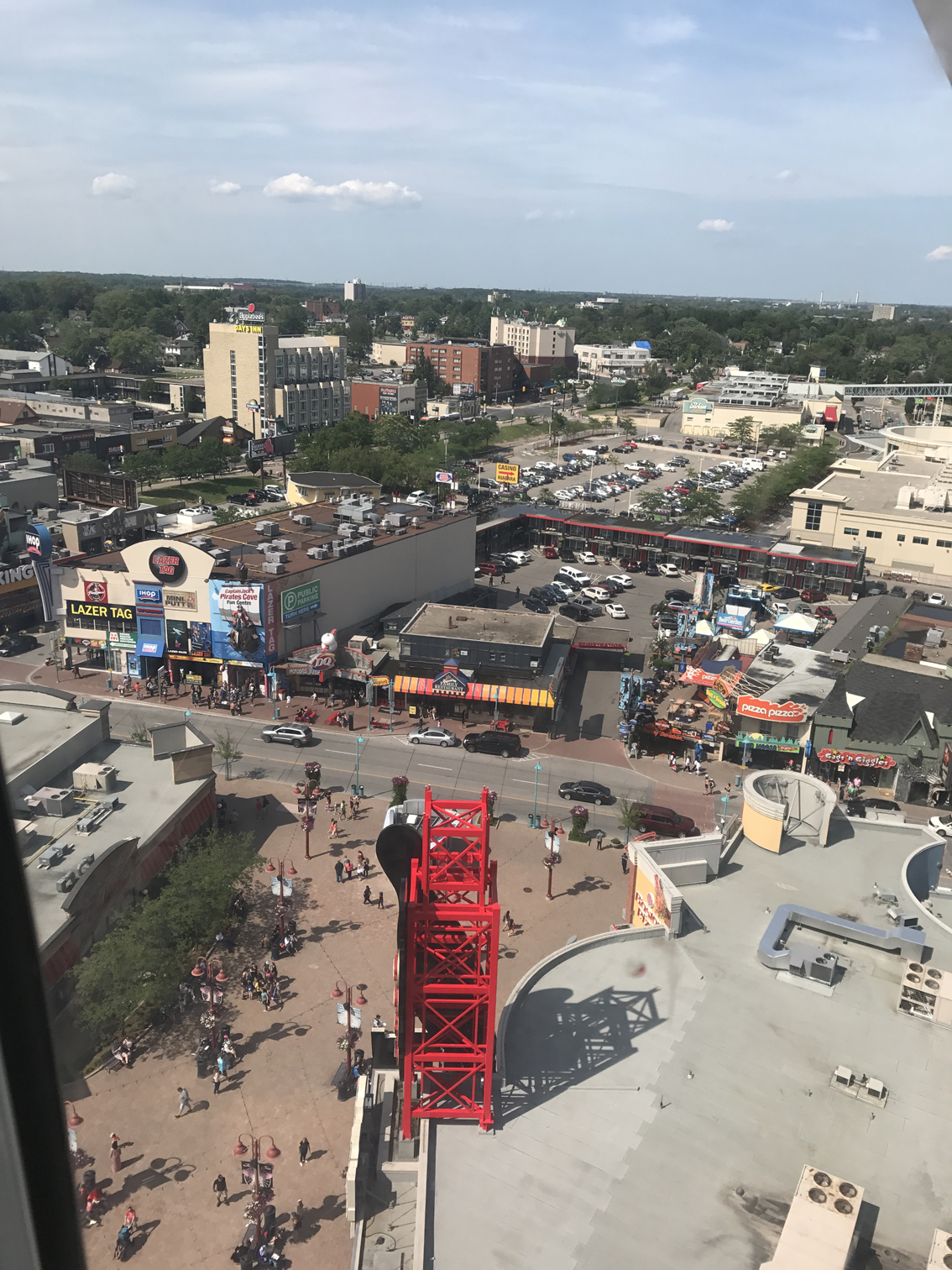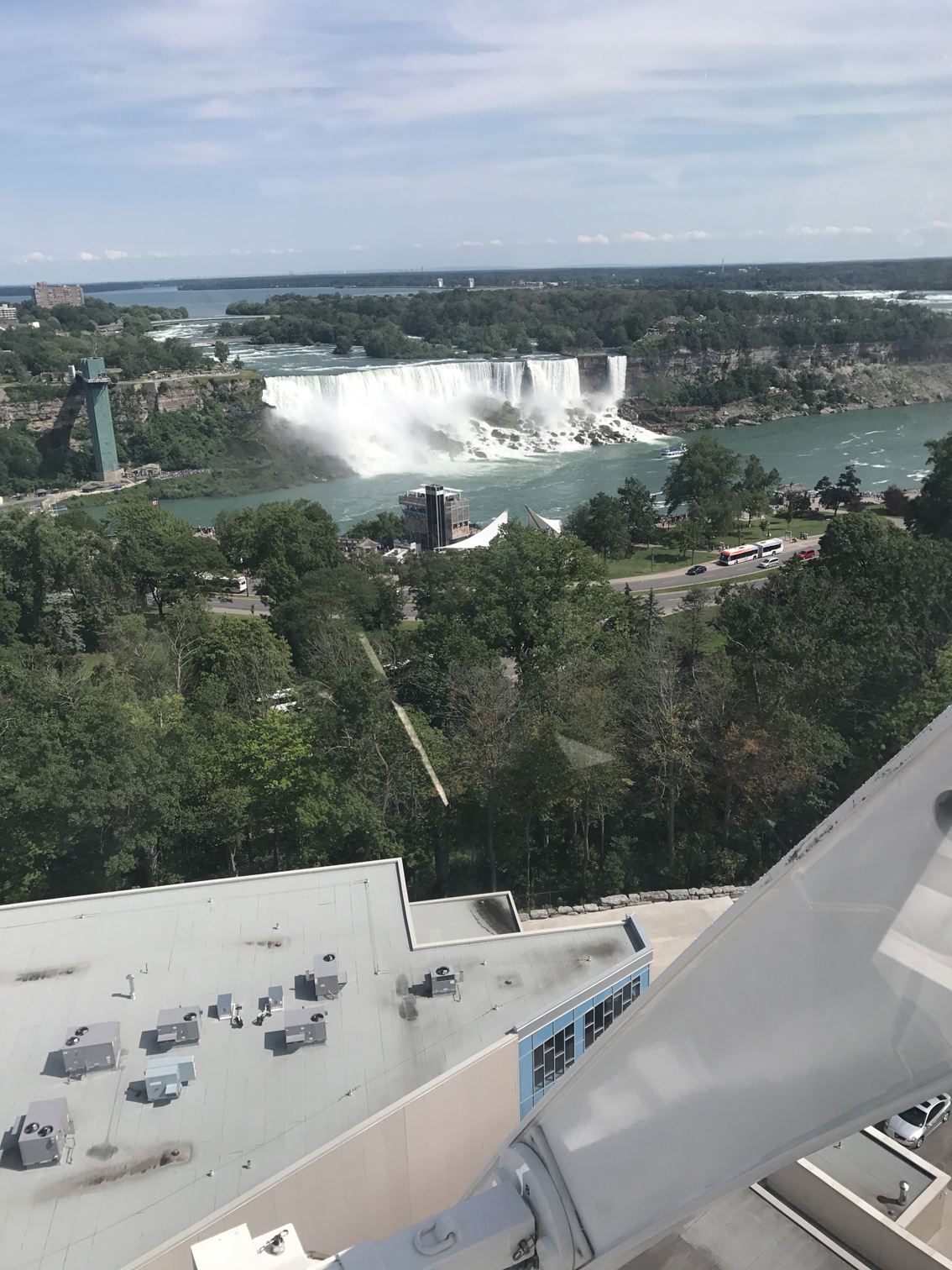 Here are the other two falls viewed from the Ferris wheel. On the left is American Falls, and that thin little strip on the right is Bridal Veil Falls. Splitting up the falls and the Niagara River is Goat Island to the right.