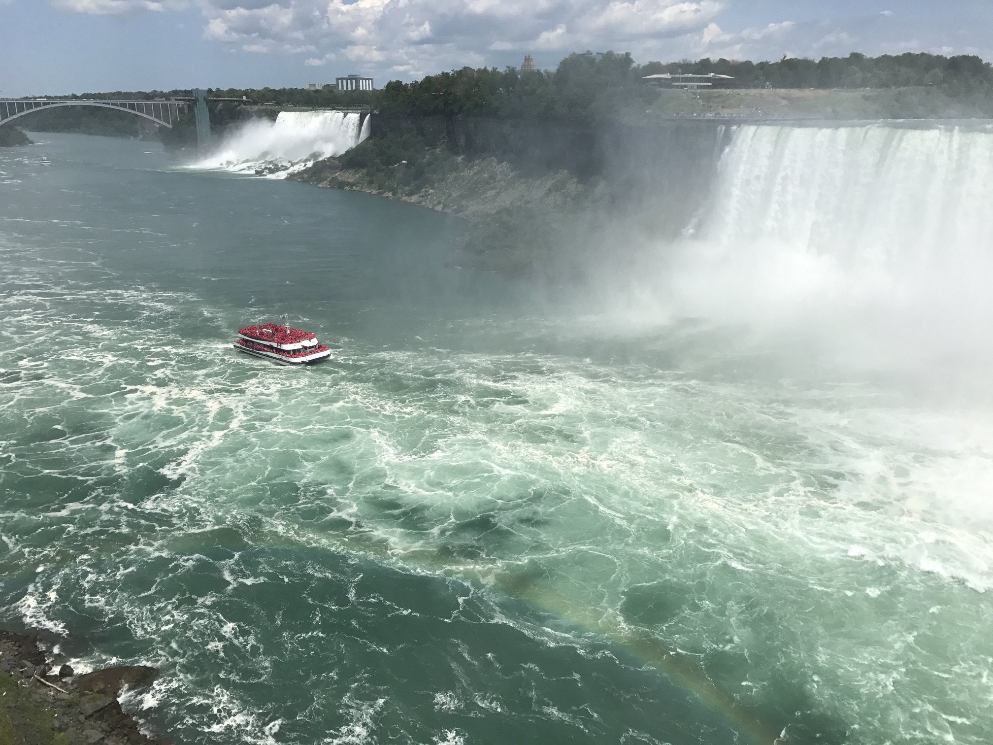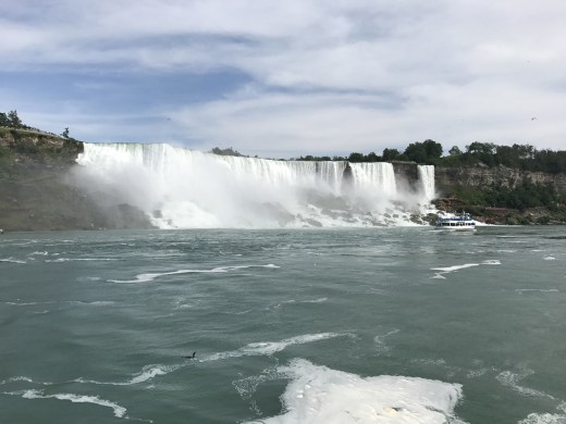 On both the American and Canadian sides, there are boat tours that get up close and personal with Horseshoe Falls. Here you can see the Canadian tour boat, called the Hornblower, making its way into the falls. The US side also has a boat tour that essentially does the same trip for US visitors and their boat is called the Maid of the Mist.