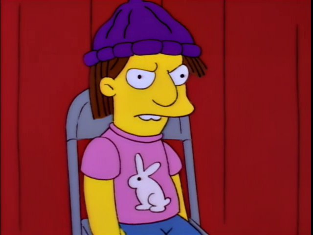 This design comes from the Simpsons season 9 episode 3 called “Lisa’s Sax”. This heart warming episode feature’s flashbacks to when Bart first began school. During this time, a young Jimbo is introduced as the school bully where he will administer noogies and nipple twisters. I decided to go a little smaller with the design on t-shirts as I think it looks a bit better.